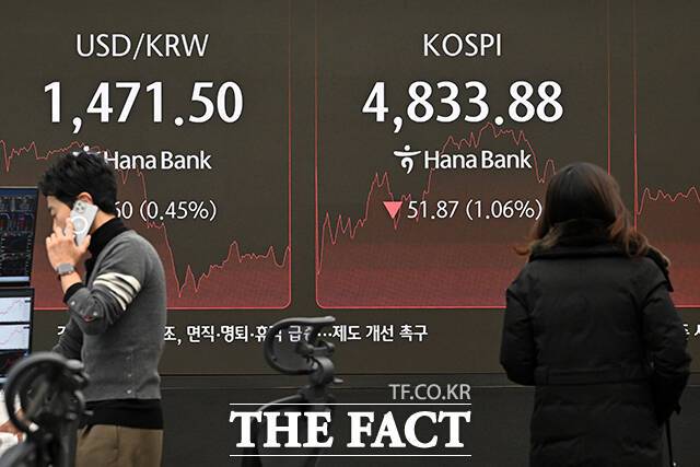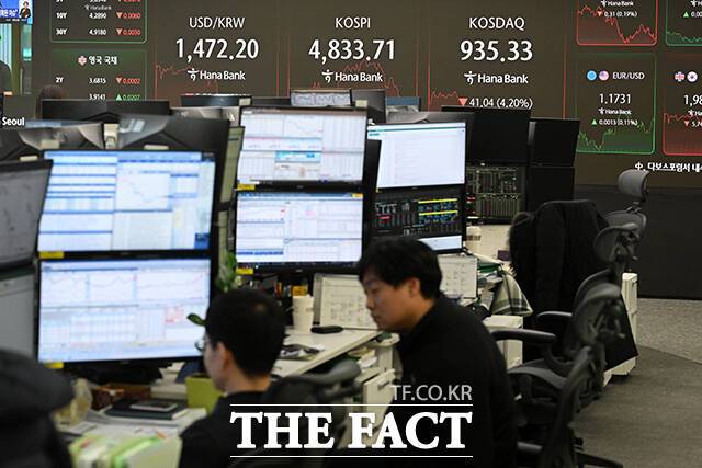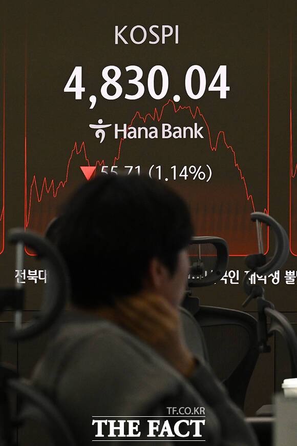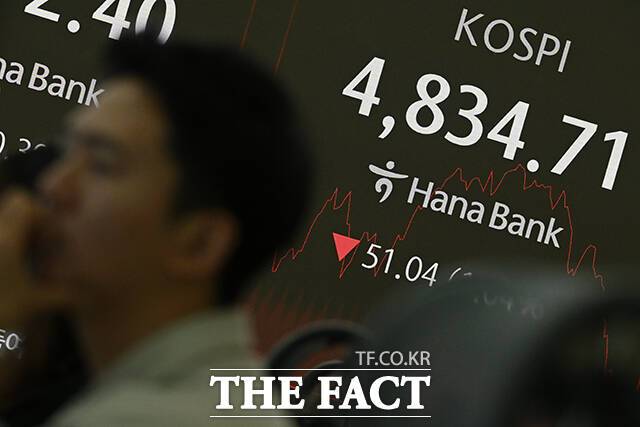 [더팩트ㅣ서예원 기자] 코스피가 뉴욕증시의 영향을 받아 4800선으로 내려간 21일 오전 서울 중구 하나은행 딜링룸 전광판에 지수가 표시되고 있다.
