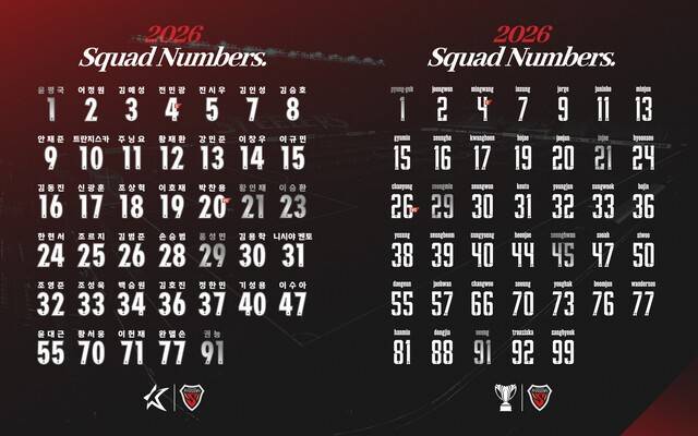 포항이 2026시즌 K리그1과 코리아컵, AFC(아시아축구연맹) 챔피언스리그(ACL) Two에서 선수단 유니폼에 새겨질 등번호를 발표했다. 주장 전민광(4번), 신광훈(17번), 기성용(40번) 등 16명은 지난 시즌과 동일한 번호를 선택했다. 신규 영입 선수 14명과 기존 선수 10명은 새로운 번호로 새 시즌을 맞이한다.