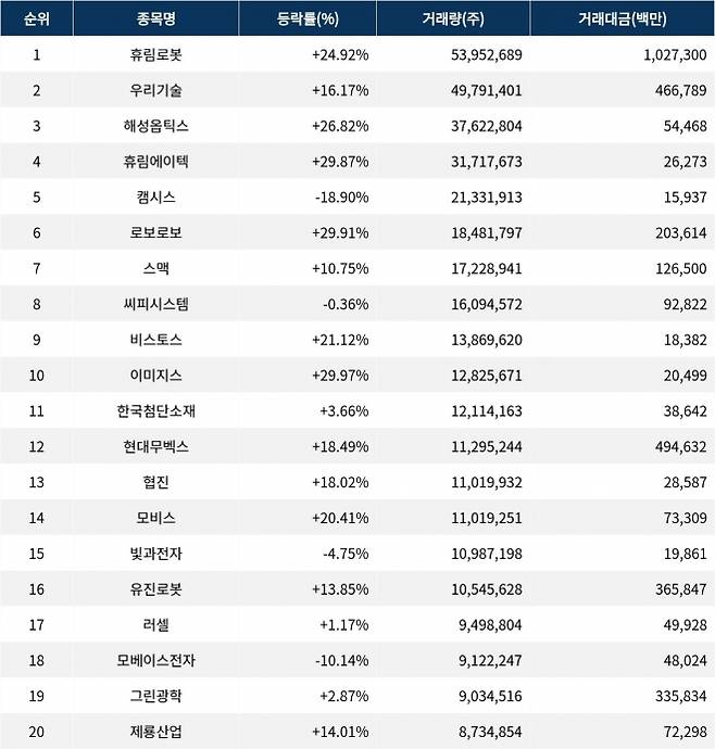 한편 거래량 상위 20위권 종목들은 한국첨단소재(062970) ▲3.66%, 현대무벡스(319400) ▲18.49%, 협진(138360) ▲18.02%, 모비스(250060) ▲20.41%, 빛과전자(069540) ▼4.75%, 유진로봇(056080) ▲13.85%, 러셀(217500) ▲1.17%, 모베이스전자(012860) ▼10.14%, 그린광학(0015G0) ▲2.87%, 제룡산업(147830) ▲14.01% 등의 성적을 기록했다.