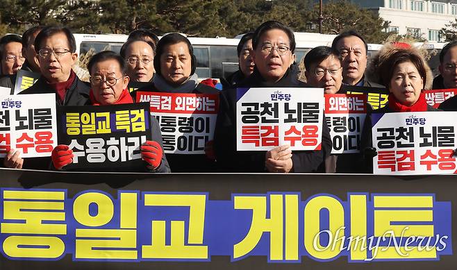 | ▲ 국민의힘 송언석 원내대표와 소속 의원들이 20일 오전 서울 종로구 청와대 앞 분수광장에서 열린 통일교 게이트·더불어민주당 공천뇌물 특검 촉구 규탄대회에 참석해 정부와 여당을 향해 쌍특검을 즉각 수용할 것을 촉구하고 있다. |