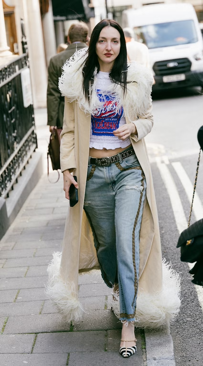 코트 는 단순한 방한 아이템이 아니라, 충분히 스타일의 중심이 될 수 있습니다. 1970년대 부두아를 연상시키는 과감한 무드의 코트를 선택해보세요. 여기에 그래픽 티셔츠와 프린트 뮬을 더하면, 데님은 자연스럽게 캔버스 역할을 하게 되죠. 레이스 트리밍처럼 디테일이 살아 있는 청바지를 고르면, 일상적인 아이템도 한층 오트 쿠튀르적인 분위기로 끌어올릴 수 있습니다.