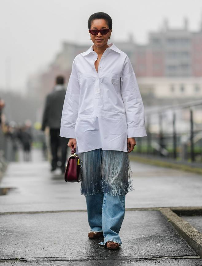 매년 연말이 지나면 반짝이는 아이템 은 옷장 깊숙이 똬리를 틀기 마련입니다. 하지만 이토록 화려한 실루엣과 데님의 궁합은 겨우내 유효하죠. 은은하게 빛나는 톱이나 액세서리를 레이어링 해 청바지에 포인트를 주세요. 이때 청바지는 헐렁한 핏을 선택하는 것이 중요합니다. 과한 장식 대신 쿨한 실루엣으로 균형을 맞추면, 부담스럽지 않은 쿨 걸 무드가 완성되죠. 슈즈는 플랫으로 마무리해 힘을 빼는 것도 잊지 마세요.