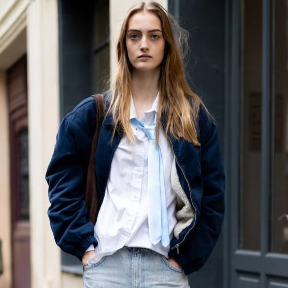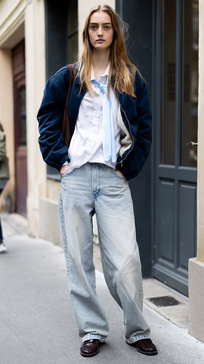 데님은 본래 남성적인 아이템과 궁합이 좋습니다. 특히 여유 있는 핏의 청바지일수록 그 장점은 배가되죠. 겨울에는 후디나 스웨트셔츠 대신 셔츠와 타이를 선택해보세요. 단정함이 더해지면서 데님 특유의 캐주얼함이 한층 세련되게 정리될 테니까요. 여기에 요즘 다시 주목받는 해링턴 재킷을 걸치면, 어렵지 않으면서도 방향성이 분명한 겨울 프레피 룩 이 완성됩니다. 힘을 준 듯 안 준 듯, 지금 가장 멋있는 균형이죠.