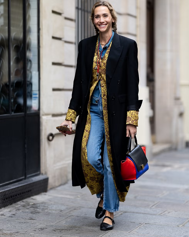 요즘 가장 성공적인 룩들의 공통점은 바로 질감의 대비 에 있습니다. 데님 역시 마찬가지입니다. 평범한 니트 대신, 예상 밖의 소재를 더해보세요. 골드 자카드처럼 화려한 원단은 데님과 만나면 오히려 부담스럽지 않게 녹아듭니다. 여기에 큼직한 울 코트를 더하면, 서로 다른 소재들이 만들어내는 긴장감 덕분에 스타일은 한층 입체적으로 보이죠. 단조로운 겨울 데님에 확실한 반전을 주고 싶다면 가장 효과적인 방법입니다.