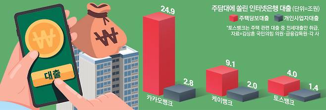 금융권에 따르면 지난해 10월 말 기준 인터넷전문은행 3사의 기업대출 합산액 6조3101억원 중 중소기업(법인) 대출은 ‘제로’다. 현재 인터넷전문은행들의 기업대출은 100% 개인사업자대출에 머물러 있다. 그나마 취급 중인 개인사업자대출 규모도 3사 주택담보대출 총액(38조원)의 16% 수준에 불과한 실정이다.