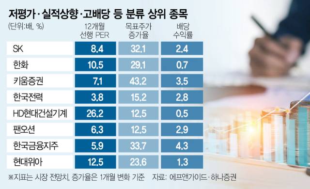 증권가에서는 국내 증시 상승세가 지금보다 약해질 것이라 판단하는 투자자들에게 저평가·고배당·호실적 기업 투자 비중을 늘리는 전략이 유효하다고 조언했다.