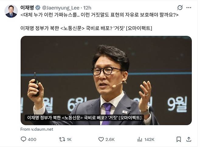 이 대통령은 이날 자신의 X(옛 트위터) 계정에 <오마이뉴스> 기사(이재명 정부가 북한 <노동신문> 국비로 배포? '거짓[오마이팩트] https://omn.kr/2grkj )를 공유하면서 "대체 누가 이런 가짜뉴스를.. 이런 거짓말도 표현의 자유로 보호해야 할까요?"라고 지적했다.