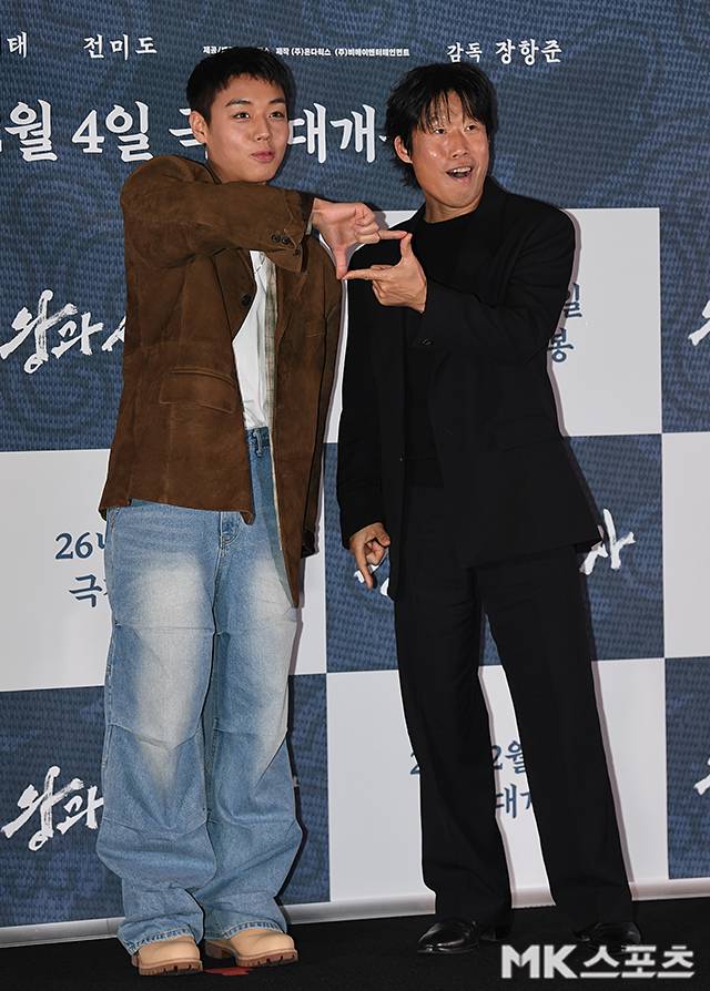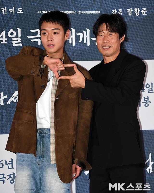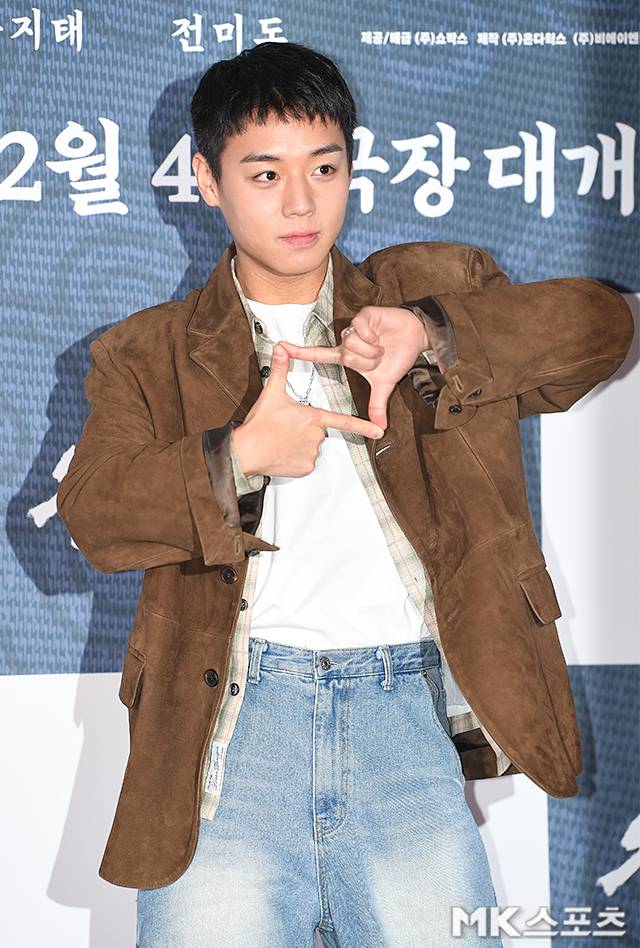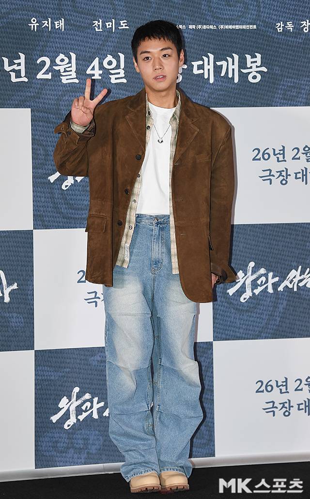 브라운 톤의 스웨이드 재킷에 화이트 티셔츠와 셔츠를 레이어드하고, 워싱이 강한 와이드 데님을 매치한 스타일 역시 의도적으로 힘을 뺀 조합이었다. 전체적인 실루엣은 정돈돼 있으면서도 날것의 분위기를 살렸고, 작품보다 앞서 나서지 않겠다는 태도가 자연스럽게 읽혔다. 포즈 역시 과하지 않았다. 간단한 V 포즈와 손으로 프레임을 만드는 제스처는 이날의 주인공이 배우 개인이 아닌 영화라는 점을 상징적으로 드러냈다.