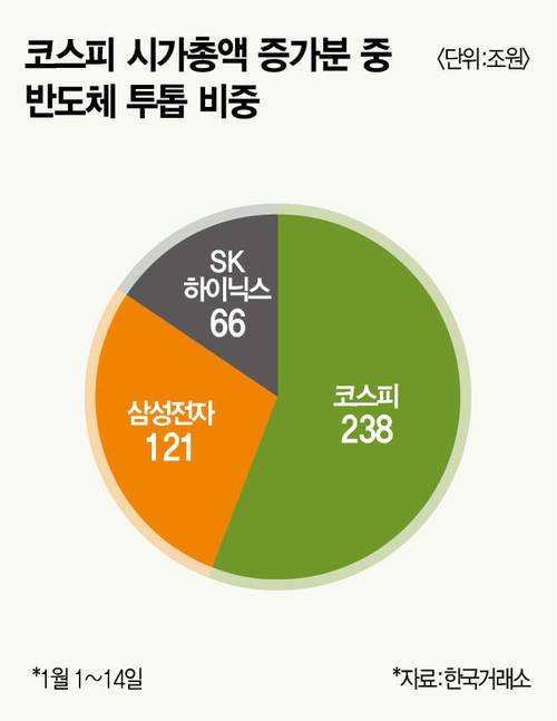 반도체 투톱 주도력은 여느 때보다 강하다. 1월 14일 종가 기준 삼성전자와 SK하이닉스 시가총액은 각각 830조원, 540조원이다. 코스피 시가총액이 3903조원이라는 점을 고려하면, 두 회사 비중이 35%를 웃돈다. 올 들어 코스피 시가총액은 425조원 증가했는데, 삼성전자와 SK하이닉스 합산 시가총액이 187조원 늘었다. 올해 코스피 시가총액 증가분 중 두 종목 비중이 44%에 달한다.