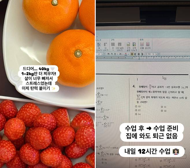 이아영은 수학 문제풀이 자료가 가득한 모니터 화면을 공유하며 “수업 후 바로 수업 준비, 집에 와도 퇴근 없음”이라고 적었다. 특히 “내일 12시간 수업”이라는 문구로 육아와 병행하는 살인적인 업무 강도를 짐작케 했다.