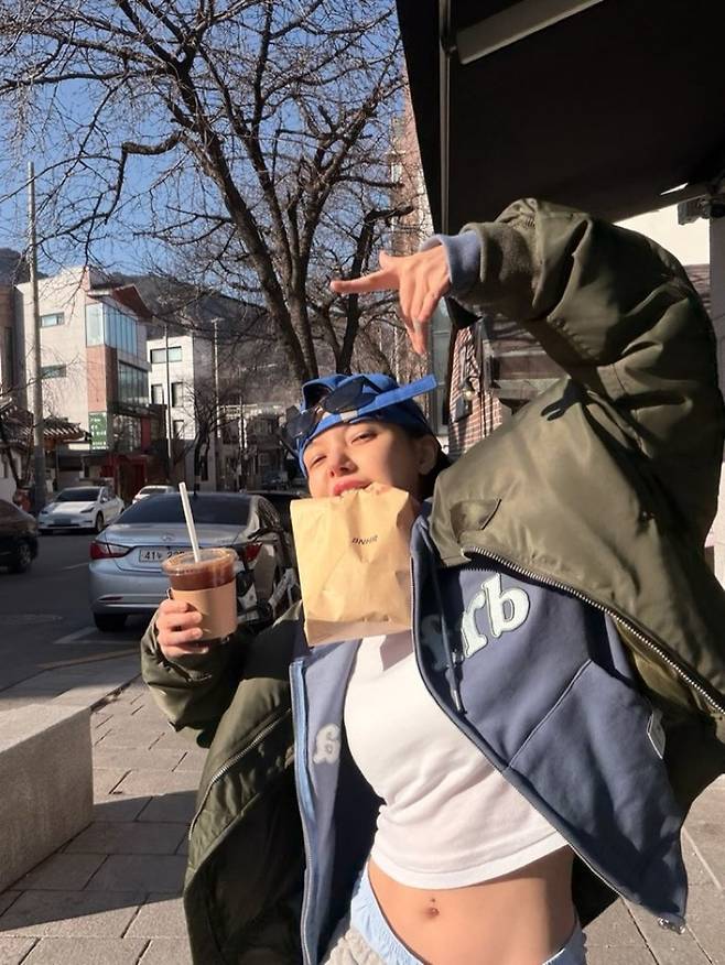 특히 최근 트렌드인 ‘레이어드 팬츠’를 완벽하게 소화한 지민은 한 손에는 아이스 아메리카노를, 입에는 빵 봉투를 문 채 장난기 가득한 포즈를 취하며 자유로운 에너지를 발산했다.