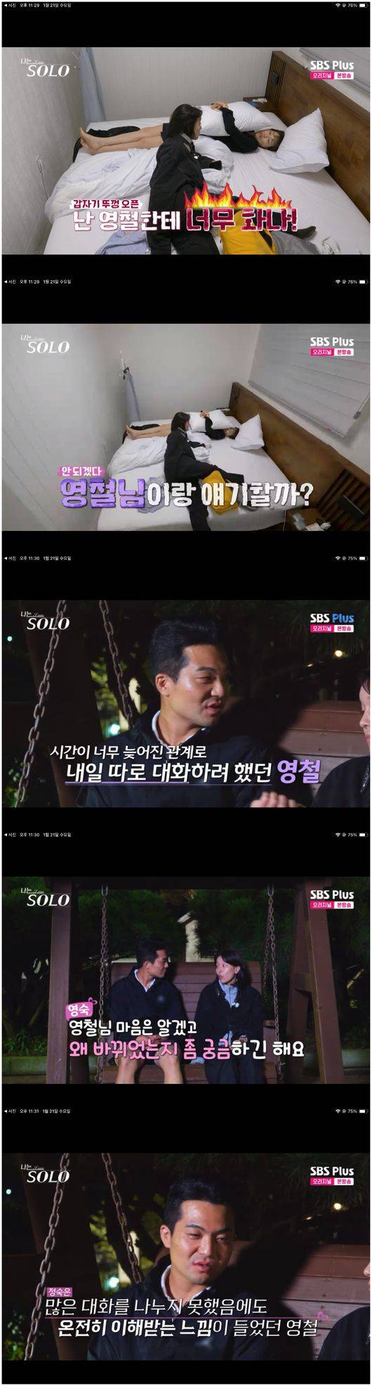 21일 방영된 SBS 예능 '나는 SOLO - 나는 솔로'(이하 '나는 솔로')에서는 정숙과의 데이트 한 영철의 마음이 마지막 데이트에서 거의 뒤집힌 가운데, 영숙은 몹시 속상해하며 영철과 대화를 나누었다.