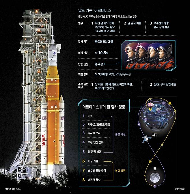 인류가 반세기 만에 또다시 은빛 달로 향한다. 미 항공우주국(NASA)이 우주 비행사를 달로 보내는 ‘아르테미스 Ⅱ’ 임무를 이르면 다음 달 6일에 진행한다고 최근 밝혔다. 1972년 아폴로 17호 이후 54년 만에 이뤄지는 유인(有人) 우주선 발사다. 이를 위해 NASA는 지난 17일 로켓 ‘우주발사시스템(SLS)’과 우주선(캡슐) ‘오리온’이 결합된 발사체를 플로리다주 케네디우주센터의 발사대로 이동시켰다. 역사 속 흑백 사진으로 접했던 인류 달 탐사의 여정이 다시 시작된 것이다.