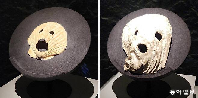 20일 부산 영도구 국립해양박물관 기획전시실. 김진태 해양박물관 선임 학예사는 부산 동삼동 패총 출토 가리비 가면과 일본 구마모토현 아타카 패총 출토 굴 가면을 차례로 가리키며 “이 유물들이 이번 전시의 클라이맥스”라고 강조했다. 아이의 손바닥만 한 크기의 두 유물은 흰색 조개껍데기에 구멍 세 개를 뚫어 눈과 입 등의 사람 얼굴을 형상화한 것이 닮아 있었다.