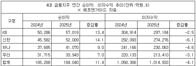 지난해 4대 금융지주의 이자수익 시장 전망치는 총 101조4천933억원으로 집계됐다. 2024년(105조8천306억원)보다 4.1% 감소한 규모다.