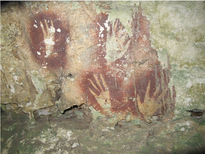 이 음각 손자국 그림은 암벽에 손을 대고 주변에 안료를 뿌리는 방식으로 만들어졌다. 훨씬 최근에 제작된 다른 그림들에 둘러싸인 상태였다.