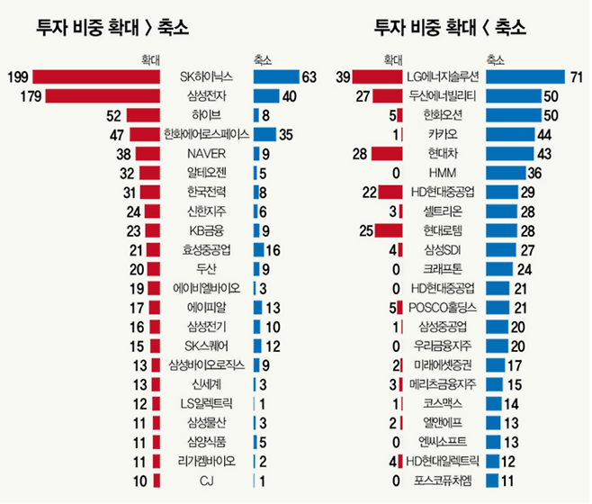 금융주는 종목별 투심이 갈린다. 상반기 신한지주와 KB금융은 편입 비중을 확대하겠다는 펀드매니저가 각각 24명, 23명으로 집계됐다. 반면 우리금융지주(20명), 미래에셋증권(17명), 메리츠금융지주(15명)는 편입 비중을 축소하겠다는 펀드매니저가 많았다. KB금융과 신한지주는 안정적인 실적과 배당이 부각되는 반면, 나머지 증권사는 최근 실적이 워낙 좋았던 탓에 기저 부담이 있는 것으로 분석된다.