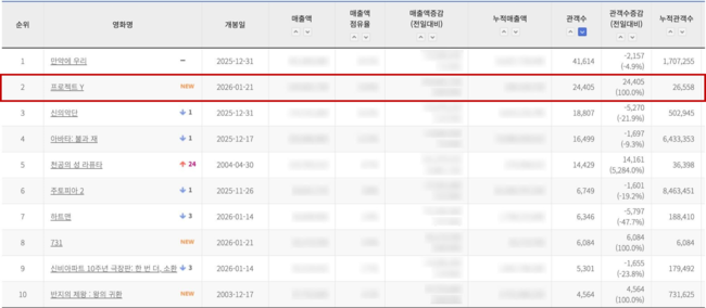 22일 영화 '프로젝트 Y'(감독 이환, 제공 플러스엠 엔터테인먼트·펜처인베스트㈜, 배급 플러스엠 엔터테인먼트, 기획 와우포인트(WOWPOINT)·클라이맥스 스튜디오, 제작 클라이맥스 스튜디오·와우포인트(WOWPOINT), 공동제작 플러스엠 엔터테인먼트) 측은 동시기 개봉작 박스오피스 1위를 기록했다고 밝혔다.