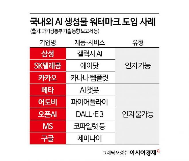 워터마크는 사용자 시각을 기준으로 인지 가능 워터마크와 인지 불가능 워터마크로 분류된다. 삼성전자와 SK텔레콤도 AI를 통한 이미지 생성물에 인지 가능 워터마크를 반영했다. 반면 구글, 오픈AI, 메타 등 해외 주요 기업들은 국제 표준인 C2PA 또는 자사 알고리즘 개발을 통한 인지 불가능 워터마크를 활용하고 있다. AI 기술 표준을 구축한 C2PA는 2021년 어도비, BBC, 마이크로소프트(MS), 인텔 등을 주축으로 설립된 글로벌 연합체다. 국내에서는 네이버, 이스트소프트가 C2PA에 가입했다.