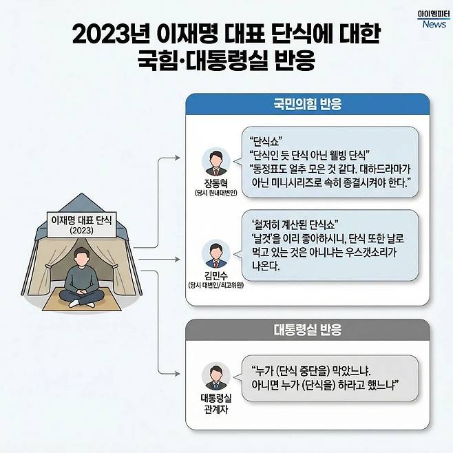| ▲ 2023년 당시 민주당 이재명 대표 단식에 대한 국민의힘과 대통령실 반응. AI를 활용해 제작한 이미지. |
