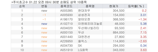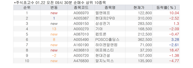 주식 투자 수익률 상위 1% 초고수들은 22일 오전 엘앤에프, 현대차2우B, 삼성전기, 기아, 펩트론, 포스코홀딩스, 하이젠알앤엠, 에프에스티, 현대건설, 알지노믹스 등을 가장 많이 순매수한 것으로 나타났다.