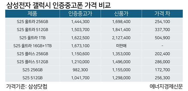 22일 삼성전자에 따르면, 갤럭시 S25 울트라 1T 모델의 인증중고폰은 162만2500원에 판매되고 있다. 신품가격(212만7400원)대비 23.7% 수준이다. 기기의 용량이 커질수록 신품 대비 할인율이 커지는 구조다.