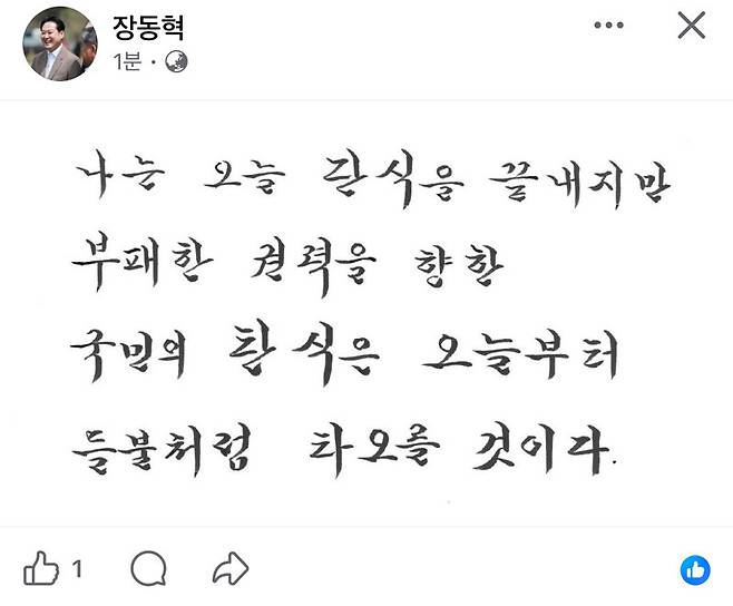 그는 “부패한 이재명 정권과 민주당의 폭정을 향한 국민의 탄식은 오늘부터 들불처럼 타오를 것”이라며 “진정한 단식은 오늘부터가 시작”이라고 했다.