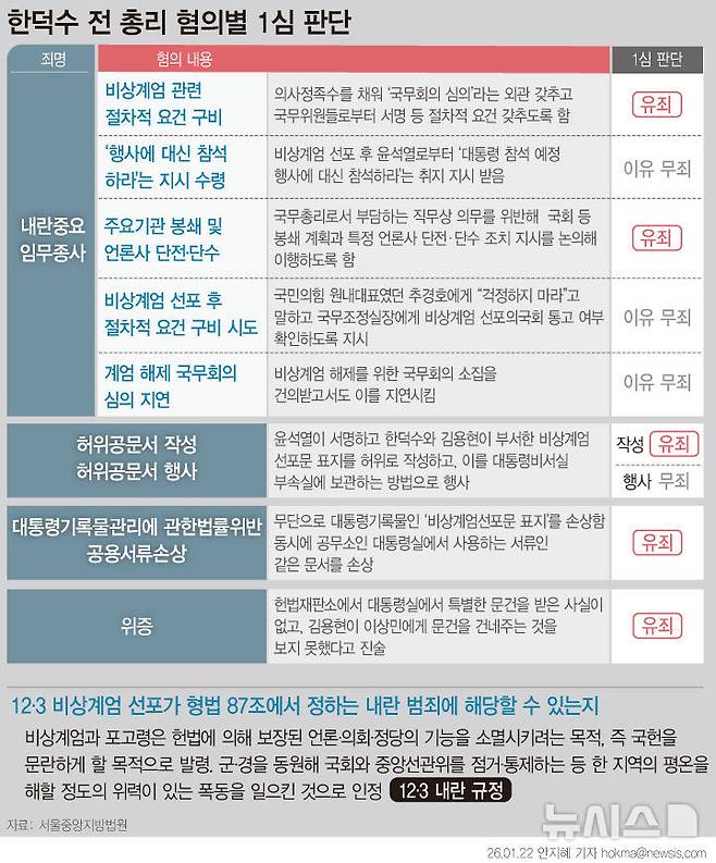 [서울=뉴시스] 서울중앙지법 형사합의33부(부장판사 이진관)는 지난 21일 내란 중요임무 종사 등 혐의로 기소된 한 전 총리에게 징역 23년을 선고했다. 한 전 총리의 내란 중요임무 종사 혐의는 '내란'이 전제돼야 성립하는 범죄로, 재판부는 12·3 비상계엄이 형법 제87조가 정한 '국헌을 문란하게 할 목적으로 일으킨 폭동'에 해당해 '내란 행위'가 인정된다고 판결했다. (그래픽=안지혜 기자)