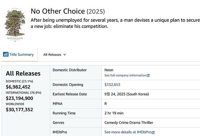 '어쩔수가없다'는 현재 국제장편영화상을 목표로 하는 작품들과의 오스카 레이스에서 하위권에 분류됐지만, 네온이 배급하는 다섯 편의 영화 중에서는 가장 높은 북미 박스오피스 성적(2위는 427만 달러의 '센티멘탈 밸류')을 올리고 있다. 오스카 레이스에선 찬밥 신세지만 네온의 실속을 채워주고 있는 건 '어쩔수가없다'인 셈이다.