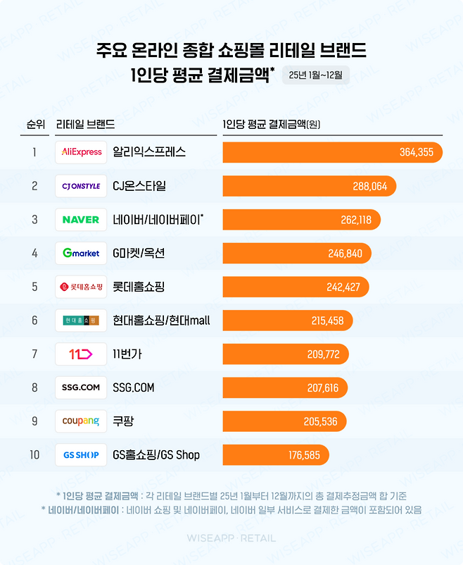 오늘(22일) 앱·결제 리테일 분석 서비스 와이즈앱·리테일에 따르면 '2025년 주요 온라인 종합 쇼핑몰 1회당 평균 결제금액(체크·신용카드 기준)'에서 CJ온스타일(200,594원)이 1위를 기록했습니다.