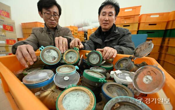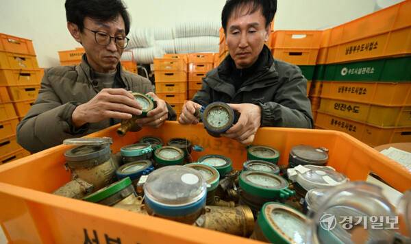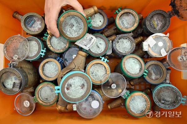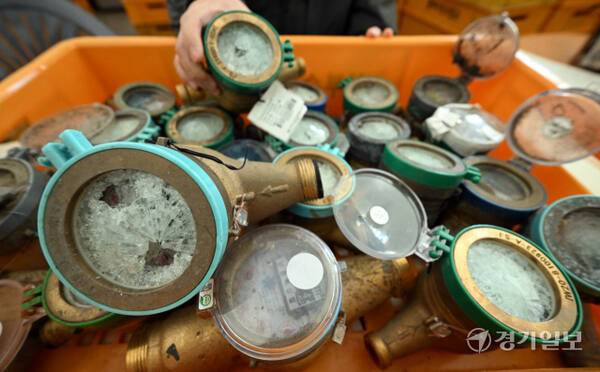 연일 영하권의 매서운 한파가 이어진 22일 인천의 한 상수도사업소에서 수도계량기 교체반 관계자가 동파된 수도계량기를 정리하고 있다. 인천상수도사업본부는 동파 예방을 위해 디지털 수도계량기 설치를 지속 확대할 계획이다. 조병석기자