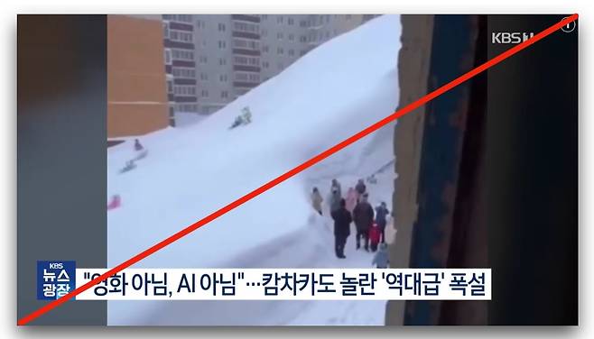| ▲ KBS 뉴스광장은 20일 ‘“영화 아님, AI 아님”…캄차카도 놀란 ‘역대급’ 폭설‘이란 제목으로 캄차카 폭설 현장 모습을 보도했는데, 이 가운데 아파트 꼭대기까지 쌓인 눈 위에서 썰매를 타는 아이들 모습 등 AI 영상도 섞여 있었다. |
