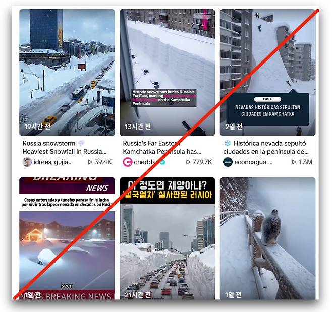 | ▲ 최근 틱톡에 올라온 캄차카 반도 폭설 관련 AI 조작 의심 영상들 |