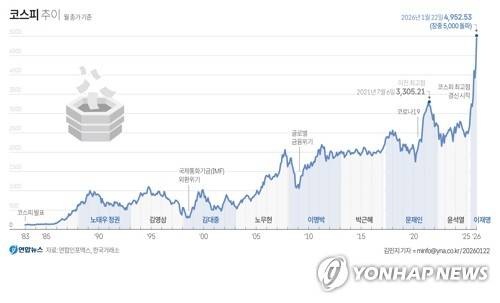 (서울=연합뉴스) 김민지 기자 = 코스피가 22일 장중 사상 처음 5,000선을 돌파한 뒤 오름폭을 줄여 4,950대에서 장을 마쳤다.