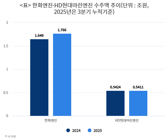 한화엔진, HD현대마린엔진은 지난해에도 수주 행진을 이어갔다. 지난해 3분기 누적 기준 한화엔진의 신규 수주액은 1조7660억원으로 2024년 전체 수주액(1조6490억원)을 일찌감치 앞질렀다. 같은 기간 HD현대마린엔진의 신규 수주액은 2024년 전체 수주액(5424억원)에 근접한 5411억원이다.
