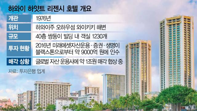 와이키키 해변 바로 앞에 위치한 하얏트 리젠시 리조트는 40층 높이의 건물 두 개에 1230실 규모의 객실을 보유해 현지에서도 랜드마크 건물로 꼽힌다. 하얏트 리젠시 리조트는 미래에셋자산운용이 2016년 블랙스톤으로부터 약 7억 8000만 달러로 당시 환율기준 약 9000억 원에 인수했다. 미래에셋운용이 설정해 운용한 맵스프론티어 미국부동산 7호 펀드에 미래에셋증권이 주요 출자자로 참여했다. 인수 초반 전체 대금 중 일부는 현지 금융기관에서 대출을 받았고, 이후 미래에셋증권 등이 추가로 자금을 투입했다.