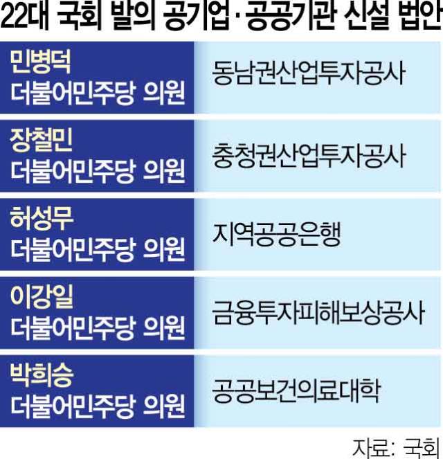하지만 이 같은 노력이 무색하게 정치권에서는 공공기관을 신설하기 위한 법안을 쏟아내고 있다. 국회 의안정보시스템에 따르면 22대 국회 들어 발의된 법안 중 새로운 공공기관을 설치하는 게 골자인 제정법만 최소 10건이 넘는다. 지역 투자를 담당하는 동남권투자공사와 충청권산업투자공사·지역공공은행·공공보건의료대학 등을 내세워 지방 인프라를 확충하겠다는 목적이다.