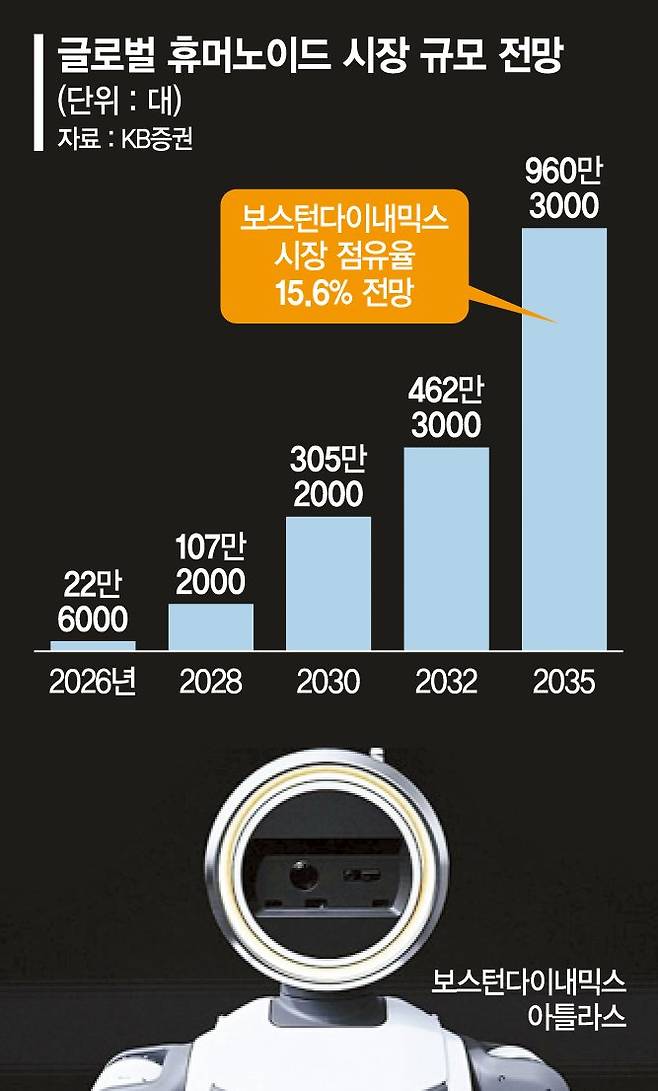 10여년 뒤 휴머노이드 시장 규모가 연간 960만대 수준으로 성장할 것이라는 전망이 나오는 가운데, 차세대 휴머노이드 로봇 '아틀라스'의 선전을 바탕으로 보스턴다이내믹스의 점유율이 15%를 웃돌 것이라는 관측이 제기돼서다.