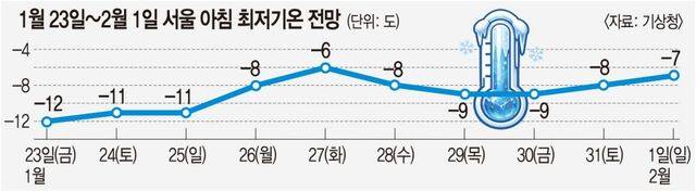 이번 한파는 장기전 양상이 될 것으로 보인다. 북극의 찬 공기가 한반도에 머물 것으로 전망되면서 주말까지 춥겠다. 이광연 기상청 예보분석관은 “서고동저(서쪽 고기압·동쪽 저기압)형 기압계와 상층 블로킹이 유지돼 찬 공기가 빠져나가지 못하고 한반도에 남아 있을 것으로 예상한다”며 “일요일인 25일까지 내륙을 중심으로 -10도를 밑도는 강추위가 이어지겠다”고 말했다. 23일 서울 아침 최저기온은 -12도로 예상됐다.