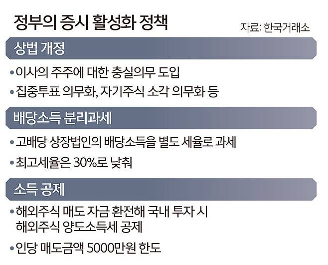 올해 도입한 고배당 상장법인의 배당소득 분리과세도 코스피 상승 배경으로 지목된다. 그간 국내 증시는 배당금이 적고 세금이 높다는 게 해외 투자를 선택하는 이유로 꼽혔다. 새로 도입한 제도는 배당소득을 분리 과세하고, 세율은 배당소득액 △2000만원 이하 14% △2000만∼3억원 20% △3억∼50억원 25% △50억원 초과 30%를 적용한다.
