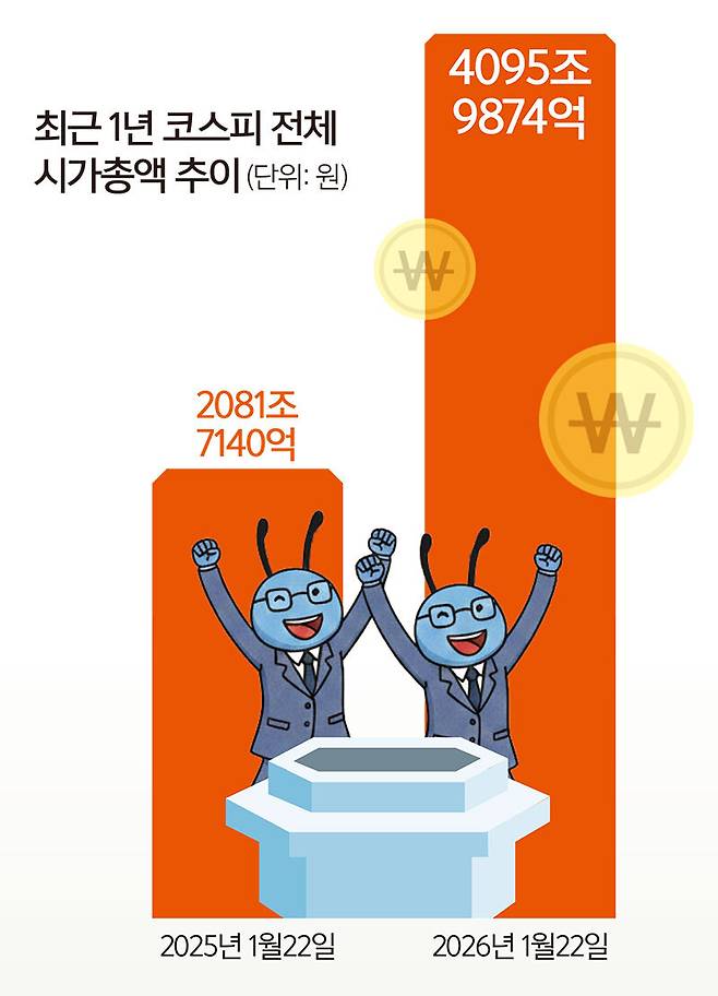 코스피가 가파른 상승세를 보인 데는 인공지능(AI) 투자 확대 기대감에 힘입은 대형 반도체주가 핵심 동력이 됐다. 코스피 투 톱인 삼성전자와 SK하이닉스는 지난해 각각 125%, 274% 급등한 데 이어 올해 들어서도 상승세를 지속했다.
