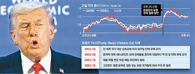 ![트럼프 대통령의 발언으로 미·동맹 갈등 우려가 완화되며 미 증시 전 업종이 급등하고 국채 금리 하락 등 ‘셀 아메리카’ 흐름이 되돌려졌다. [사진 = 연합뉴스]](https://img1.daumcdn.net/thumb/R658x0.q70/?fname=https://t1.daumcdn.net/news/202601/22/mk/20260122191504639zshk.jpg)