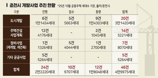 지난해 기준 춘천시가 파악한 개발사업 추진 현황은 진행 24건·2만2220세대, 접수 10건·9707세대, 동향 12건·1만8048세대 등 총 4만9975세대에 달한다.