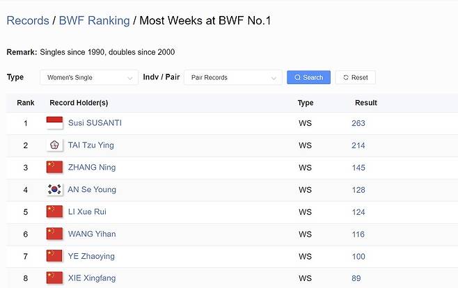 역대 최고의 여자 배드민턴 선수 1위인 1990년대 슈퍼스타 수시 수산티(인도네시아·263주), 최근 은퇴를 선언한 대만의 레전드 타이쯔잉(214주)은 모두 통산 200주 이상 세계 1위를 기록했다. 안세영이 앞으로 나아갸야 하는 길이다.