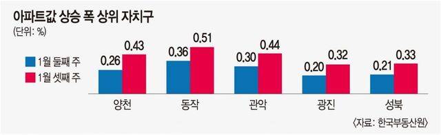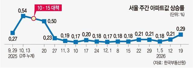 22일 한국부동산원이 발표한 1월 셋째 주 주간아파트가격동향에 따르면 서울 아파트값은 0.29% 상승했다. 10·15 대책 직후인 10월 마지막 주부터 전주까지 0.17~0.23% 사이에서 등락을 반복하던 상승률이 큰 폭으로 오른 것이다. 10월 셋째 주(0.50%) 이후 13주 만에 가장 높은 상승률이다.