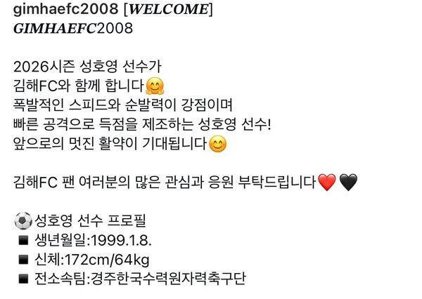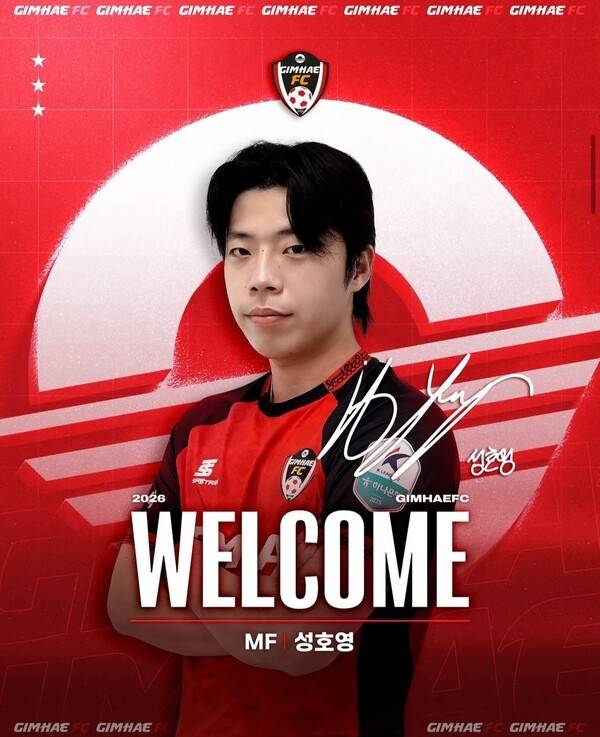김해는 20일 구단 공식 사회관계망서비스(SNS)를 통해 성호영 영입을 발표하며 "2026시즌 성호영 선수가 김해와 함께 합니다. 폭발적인 스피드와 순발력이 강점이며 빠른 공격으로 득점을 제조하는 성호영 선수! 앞으로의 멋진 활약이 기대됩니다. 김해 팬 여러분의 많은 관심과 응원 부탁드립니다"라고 덧붙였다.