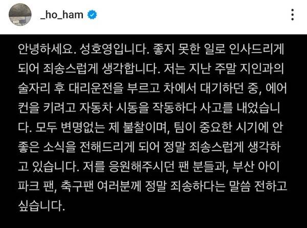 성호영은 자신의 SNS를 통해 "좋지 못한 일로 인사드리게 되어 죄송스럽게 생각합니다. 저는 지난 주말 지인과의 술자리 후 대리운전을 부르고 차에서 대기하던 중, 에어컨을 키려고 자동차 시동을 작동하다 사고를 내었습니다"라는 사과문 함께 고개를 숙였지만, 황당한 해명으로 비판 받았다.