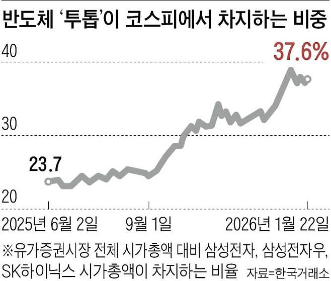 ‘5000 고지’ 도달의 막바지는 반도체가 주도했다. 반도체 수퍼사이클 기대에 작년 10월 27일 코스피는 사상 처음 4000선을 넘었고, 11월엔 AI 거품 우려로 잠시 주춤했지만, 올 들어 현대차가 로봇 테마로 부각되는 등 증시를 이끄는 종목군이 넓어지며 결국 5000선을 넘었다.