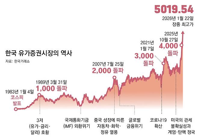 이재명 정부 출범 이후 코스피는 지난해 10월 4,000 선을 넘은 데 이어 불과 3개월 만에 5,000까지 도달했다. 43년 코스피 역사상 가장 가파른 상승세다.
