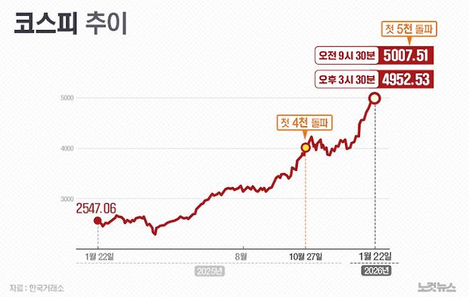 꿈의 지수 '코스피 5000'이 22일 장중 현실화됐다. 인공지능(AI) 산업과 반도체 슈퍼 사이클에 대한 기대감으로 삼성전자와 SK하이닉스 등 '반도체 투톱'이 하드캐리하고, 자동차, 방위산업 등 전반으로 이익 개선이 확산한 결과라는 해석이 나온다.